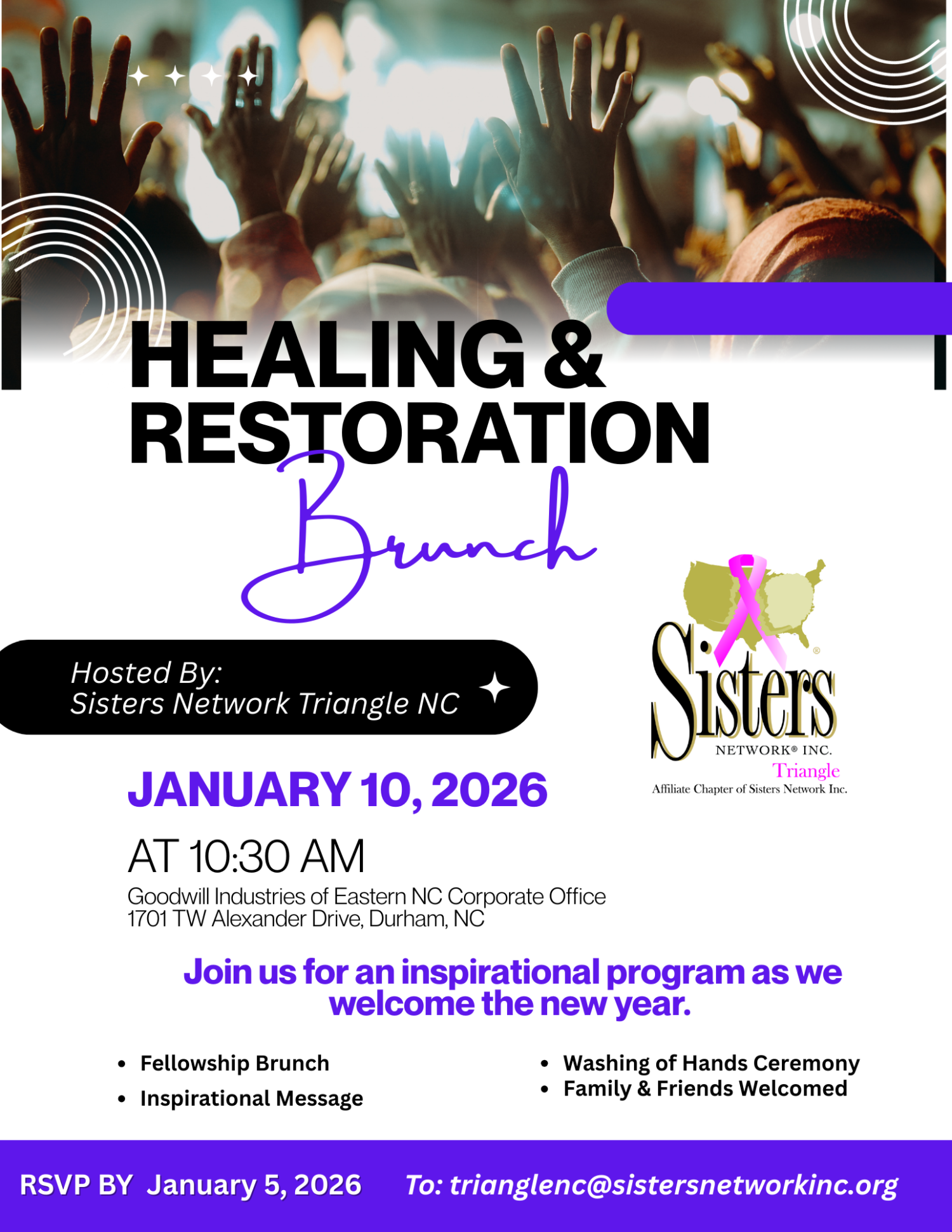 RSVP by Jan. 5th to: trianglenc@sistersnetworkinc.org Please join us for the "Healing and Restoration Brunch" an inspirational program as we welcome the new year. Fellowship Brunch Inspirational Message Washing of... |